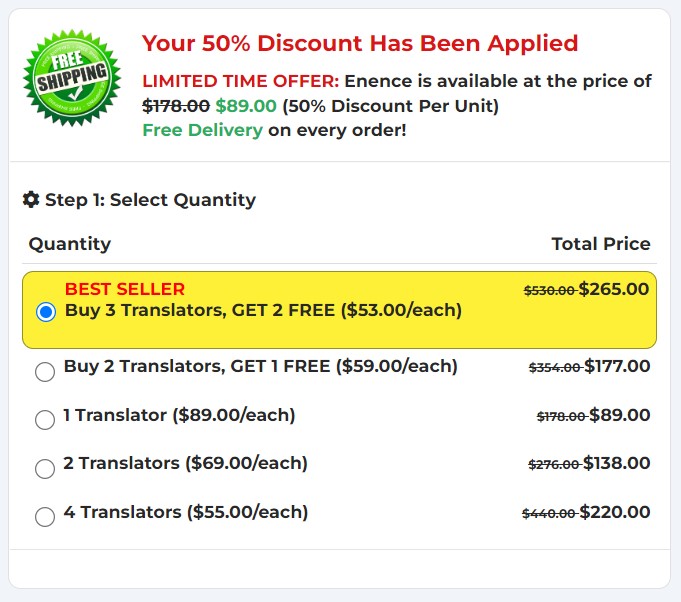 Muama Enence hinta on hyvin kohtuullinen ja saat siitä 50 % alennuksen. Tämä pikakääntäjä maksaa 178 euroa, mutta alennuksen jälkeen hinta on vain 89 euroa. Saat siis 89 euron tuen Business Finlandilta.